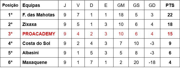 Outro destaque desta caminhada é o setor defensivo da ProAcademy, que encerra esta etapa do Campeonato como um dos mais consistentes da competição. A solidez da defesa e o comprometimento dos jogadores traduzem o espírito de equipa e a disciplina que são marcas do projeto. Independentemente dos resultados finais, a campanha reafirma o compromisso da ProAcademy com a formação desportiva e humana dos seus atletas, construindo bases sólidas para o futuro.
