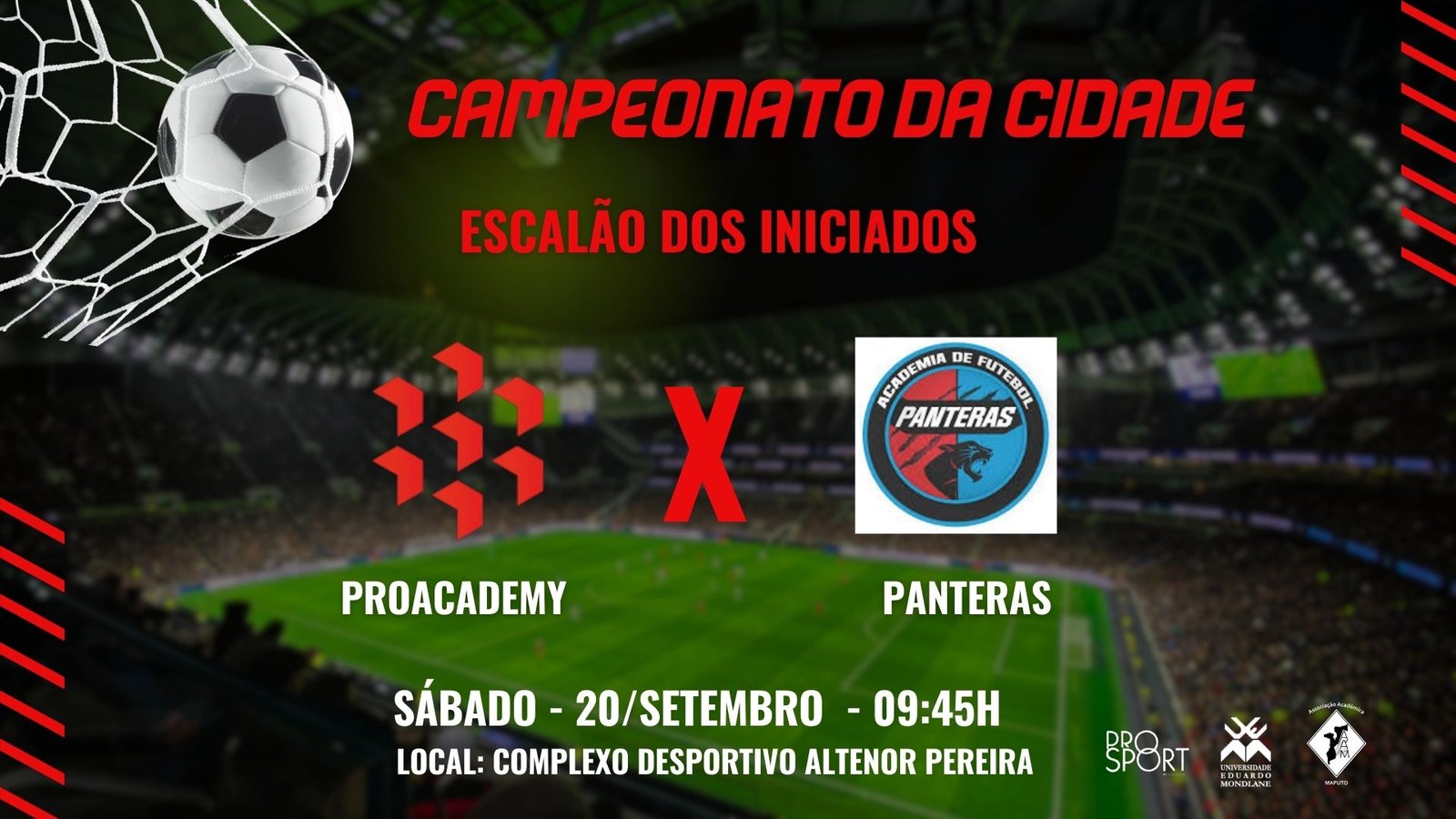 A ProAcademy volta a campo neste sábado, 20 de setembro, para disputar a próxima jornada do Campeonato da Cidade dos Iniciados. O desafio será frente ao atual líder da competição, a equipa dos Panteras, em um confronto que promete muita intensidade e qualidade. Com o melhor ataque do torneio, somando já 23 golos marcados, a nossa equipa chega motivada para mostrar toda a sua força ofensiva diante da sua torcida.