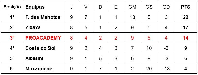 O Zixaxa ocupa atualmente a segunda colocação com 17 pontos, mas a ProAcademy tem a chance de igualar essa pontuação e ultrapassar o adversário pelo saldo de gols. O duelo promete equilíbrio, já que ambos os conjuntos se destacam por suas defesas sólidas: em 8 jogos disputados até agora, tanto a ProAcademy, quanto o Zixaxa, levaram apenas 5 golos. O confronto direto, portanto, ganha contornos decisivos para definir quem ficará em melhor posição na tabela.